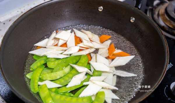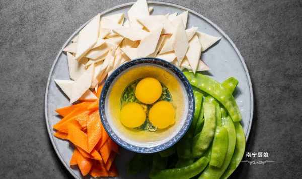准备食材:山药150克,荷兰豆100克,胡萝卜100克,鸡蛋三个。