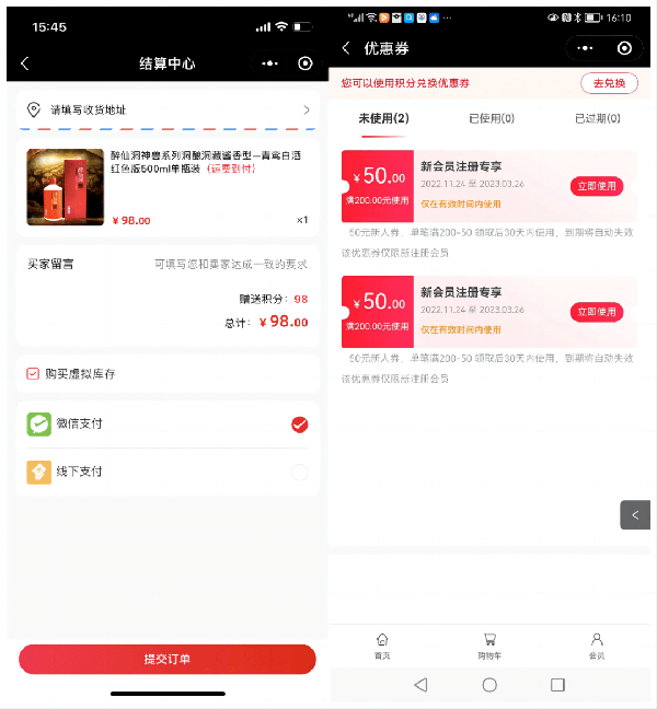 同时,在琼台酒业小程序商城内新注册的会员,赠送"100元满减优惠券",提高首单转化率,多购物场景+灵活配送方式,让消费者在有节日送礼需求时,会优先想到“琼台酒业“。而且,不管是线上还是线下消费,都有购买渠道,客户就会主动找过来。