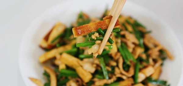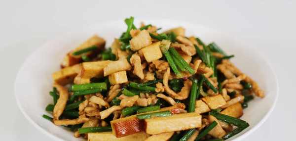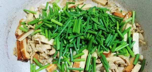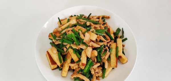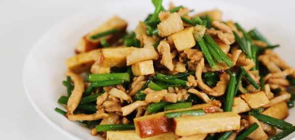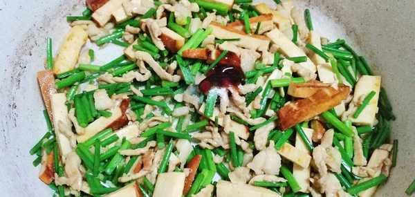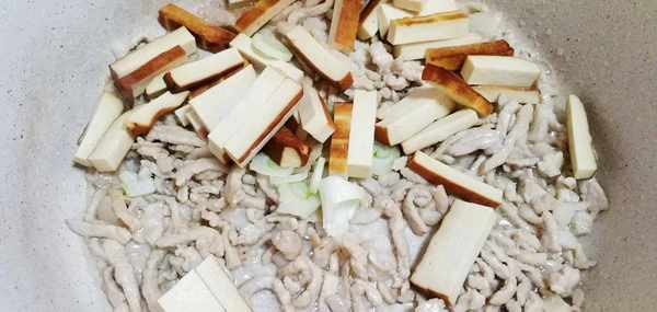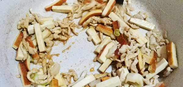 锅中油热放入腌制好的肉丝炒至变色,放葱花,香干翻炒2分钟