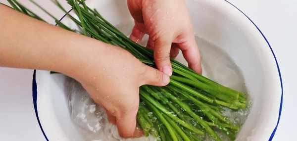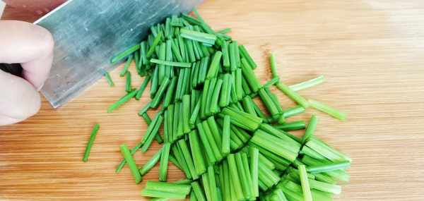 掐去尾部的老梗和顶端的花,只留中间嫩嫩的韭菜苔梗炒着吃