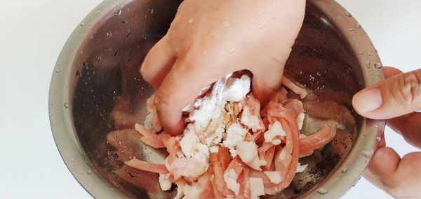 猪肉洗净切丝放入小盆中,加一勺料酒,1勺生抽,1勺淀粉充分抓拌均匀腌制10分钟