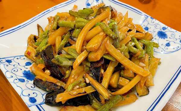 地三鲜是东北菜中的经典之一。可谓百吃不厌。主要是土豆、茄子和青椒。三种成分均为天然绿色成分。它们尝起来很清爽,是我最喜欢的菜。蔬菜。在东北菜馆吃饭,千万不能按常理点菜。一般南方餐馆,两个人可以点3道菜。