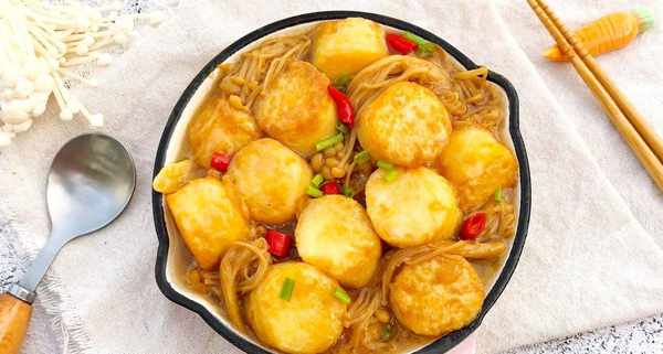 3、锅内留少许油,放入香葱、大蒜炒香,再加入少许水,倒入炸好的日本豆腐、金针菇翻炒几下;