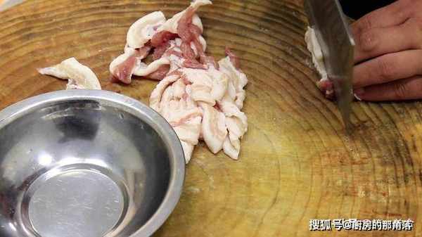 1.五花肉一块,从中间下刀切至肉皮,按紧以后,把肉皮去掉不用,再切成五花肉片,尽量的切匀一点,放在盆中。