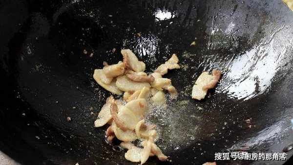 4.下面,我们开始烹饪,锅内烧油,加入五花肉煸炒,把五花肉煸炒出油,用勺子撇去多余的油脂,吃起来口感不会油腻。