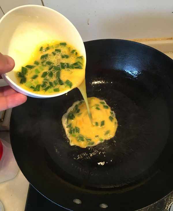 第二步:锅上火烧热,加底油然后迅速将鸡蛋打入摊成蛋饼拿出。