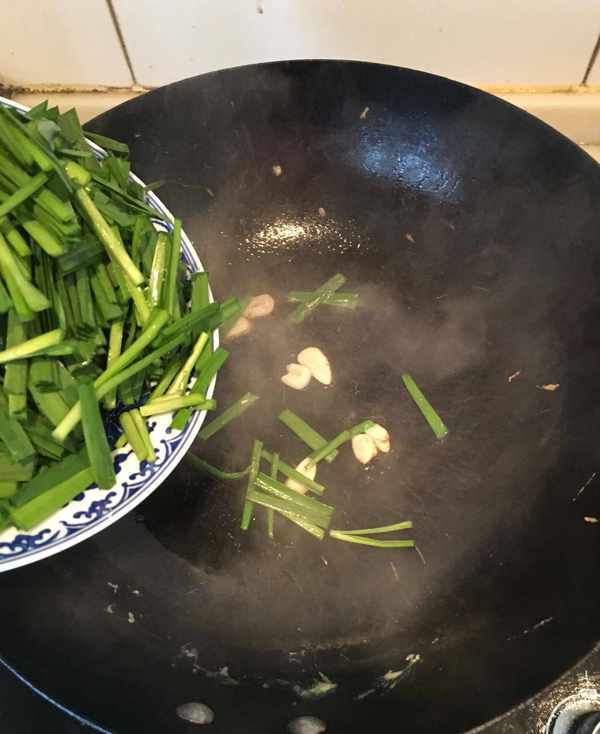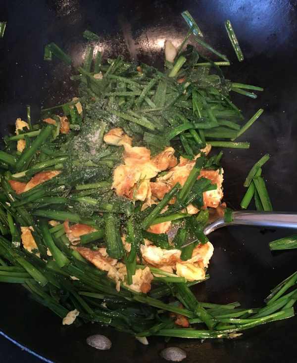 第三步:锅里加油下蒜片煸香,迅速将韭菜段加入然后将鸡蛋一起加入调适量的盐大火翻炒在韭菜塌殃前淋香油出锅即可。(别看它简单,炒这个菜一定要快,在韭菜塌殃前出锅,如果时间长了韭菜塌殃了就不好看也不好吃了)