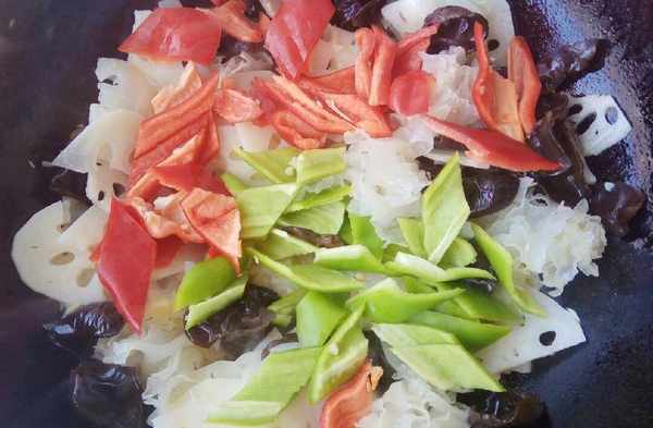 材料:莲藕一节,木耳半碗,银耳半个,红椒一个,青椒一个,生抽一勺,麻椒一勺,大蒜半个,盐一勺