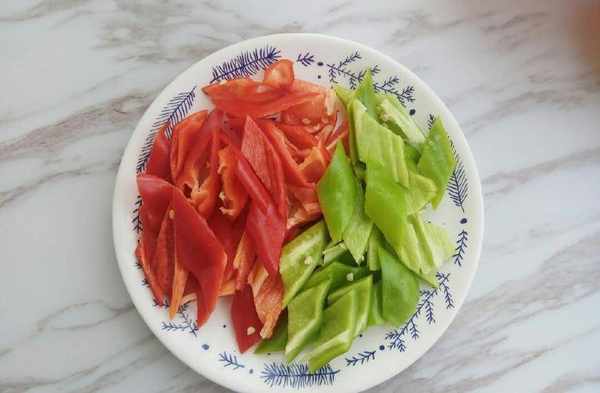 9、把青红椒切块备用