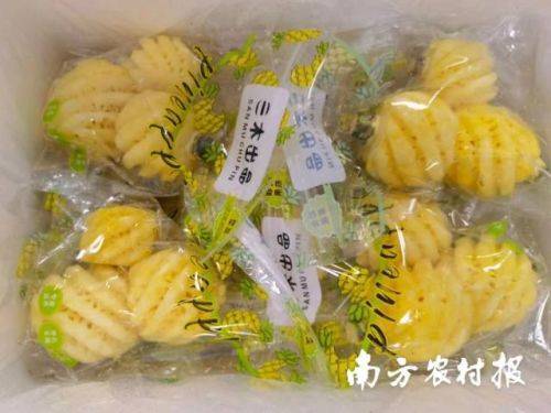 削皮、去果眼、清洗、泡盐水......要想吃上一块鲜甜的徐闻菠萝确实不太容易,于是,广东人研究了鲜切菠萝,选用9两以下的小菠萝,削好皮、包装好,消费者收到,现开现吃,不仅方便了许多,也成了一种特别的饮食方式,鲜切“小菠萝”成了万人迷,供不应求。