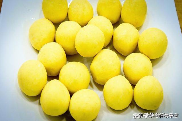 和好以后用手揪下一个小面剂子,用手心揉成小圆球,做成一个个红薯丸子,放在盘中备用。