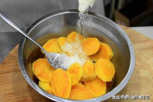 然后把蒸熟的红薯放在盆中,加入白糖20克增加甜度,用勺子按压成红薯泥。