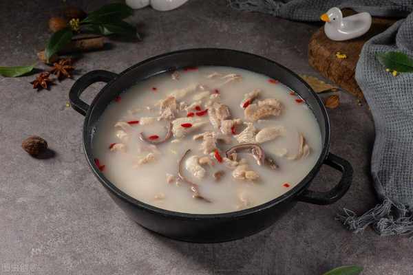 4、翻炒均匀后加入猪肚再加入清水煮沸煮30分钟小火,之后再加入我们切好的鸡,煮20分钟,再加入盐、党参、枸杞煮20分钟即可出锅!