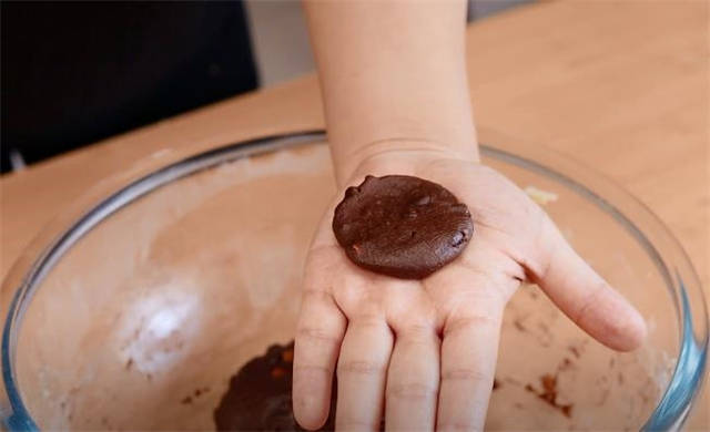 5.做饼干的时候,不用借助模具,我们直接揪去适量的大小,在掌心团一下,团到非常匀称的状态的时候,直接用手掌按扁,这个饼干的模型就出来了。