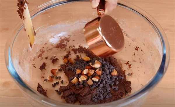 4.刚才拌好的可可面粉,我们直接加在里面,搅拌到看不到干粉的时候,我们里面放一些耐高温的巧克力豆还有干果。
