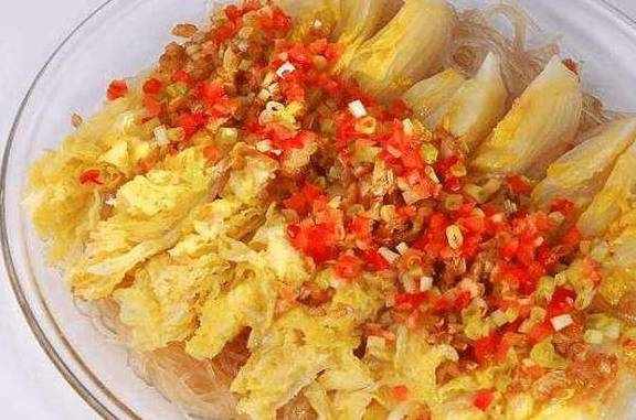 材料:娃娃菜两颗、绿豆粉丝、红椒、蒜瓣、香葱、生抽、白砂糖、鸡精、清水、香油。