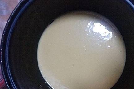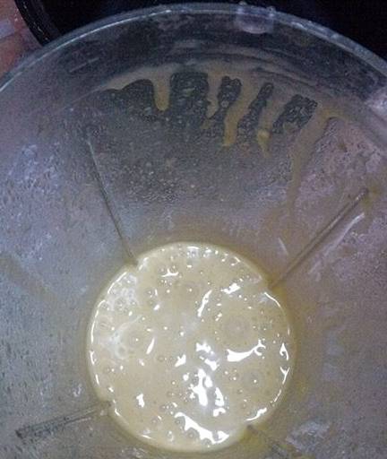 4、电饭锅内胆刷一层薄薄的油防粘将打好的面液倒入摔一摔把气泡弄出