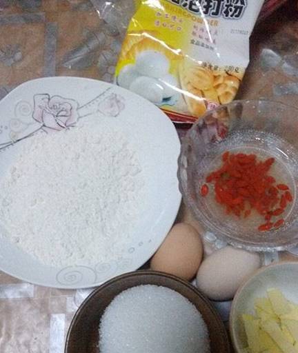 鸡蛋、低筋面粉、黄油、泡打粉、白砂糖、枸杞子、橄榄油