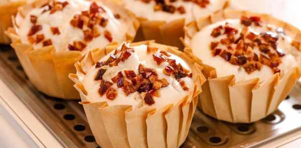 5.红枣先去核切丁;将拌好的米糊放入蛋糕杯中,倒入模具中,至90%满。