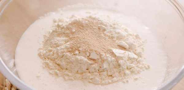 2.倒入大碗中,加入酵母、高筋面粉,搅拌均匀。