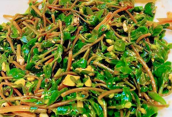 3、简单做酱汁,将蒜茸、白芝麻、葱花放入碗中,倒入热油激香,加入白糖、鸡精、生抽、盐调味,拌匀,淋在马齿苋上,转身。搅拌均匀,你就可以吃了。马齿苋被称为“长寿之菜”,味道清香,药食同源。