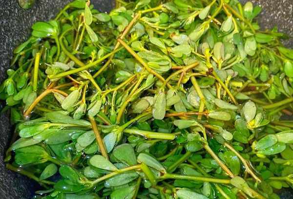 2、锅中烧开水,将马齿苋撒入水中,加少许盐和植物油使颜色更绿。烤两三分钟后,再过冷水,捞出控水,给大份切小块,方便食用。