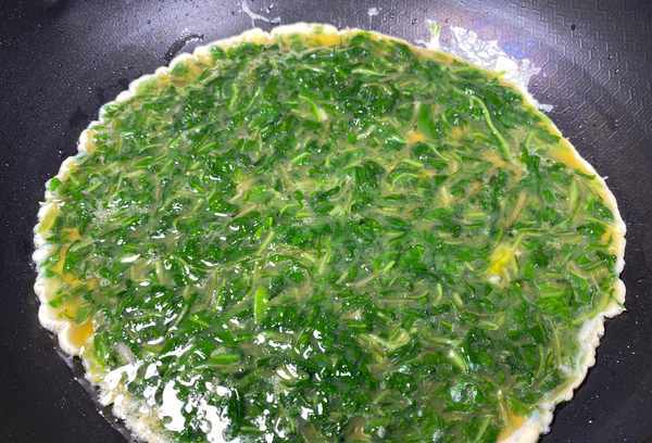 2、鸡蛋3个打入碗中,倒入蒲公英,加少许盐调味,拌匀,锅中油烧热,油热时倒入蛋液,轻轻撒在碗底,中小火加热,煎至鸡蛋熟透,炒香。