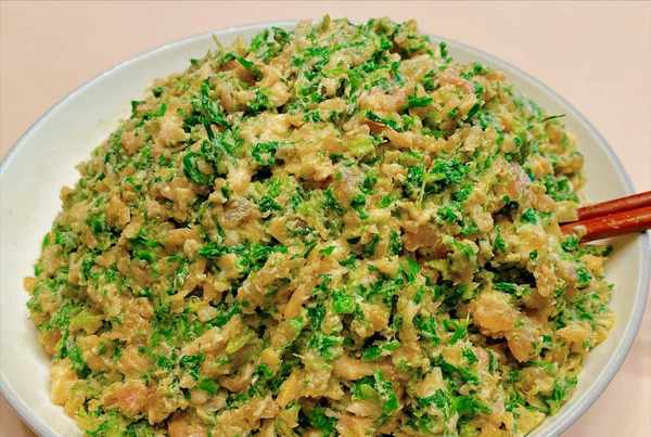 3、这样做的阴囊饺子馅料细嫩多汁,营养美味,味道独特。菜市场的蔬菜吃多了,可以试试野菜的味道,鲜美多汁,软软的,非常美味。