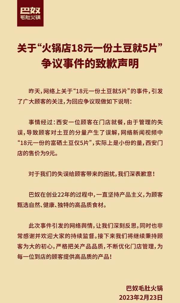 2月23日,巴奴毛肚火锅官方微信发布《关于“火锅店18元一份土豆就5片”争议事件的致歉声明》。
