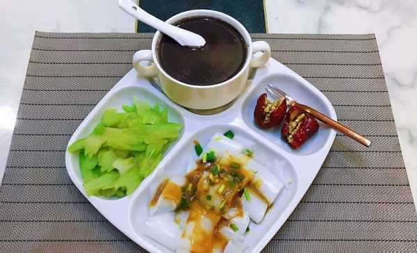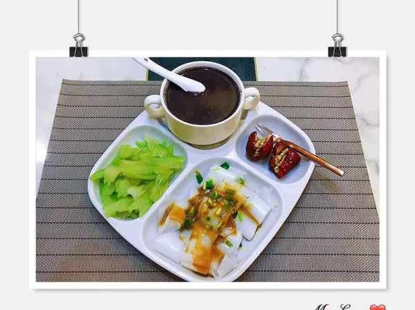 早餐:营养豆浆、芝麻酱肠粉、油醋汁西芹、抱抱果。