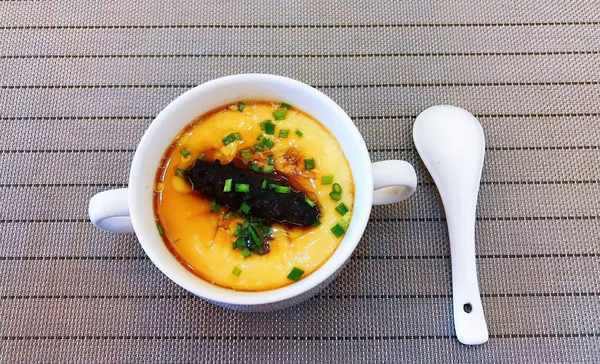 2. 取1个鸡蛋打在碗中,加水按1:1.5比例(这个看鸡蛋大小减少水量),加冷水或温水都可以,打散后,过滤一遍,没有过滤工具,可以打去上面的泡泡,蛋碗盖上一个盘子,水开上锅蒸10分钟,海参焯水去腥,水中放点姜葱和料酒,焯水后的海参放到蛋面上,继续再蒸2分钟,淋上蒸渔鼓油和香油。