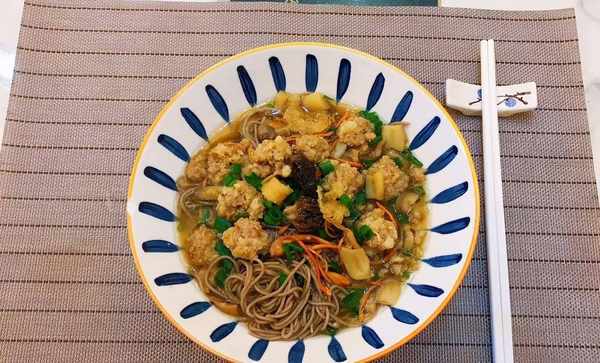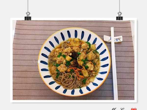3. 解冻的肉泥加生抽、料酒、盐、蒜末、生粉、香油搅打上筋,用勺子将肉丸舀进锅中,煮开后放少许荞麦面,煮熟后放盐调味,撒上葱花,汤鲜味美,这碗面吃完还意犹未尽。