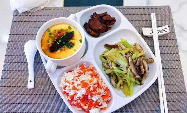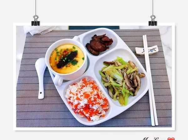 午餐:西芹炒香菇、海参蒸蛋、香肠、胡萝卜饭。