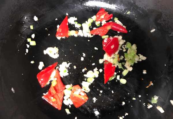 6、锅中倒入少许花生油,油温6成热放入葱花和蒜末,炒出香味,倒入红辣椒片继续翻炒,全程小火慢炒,大火容易炒糊;