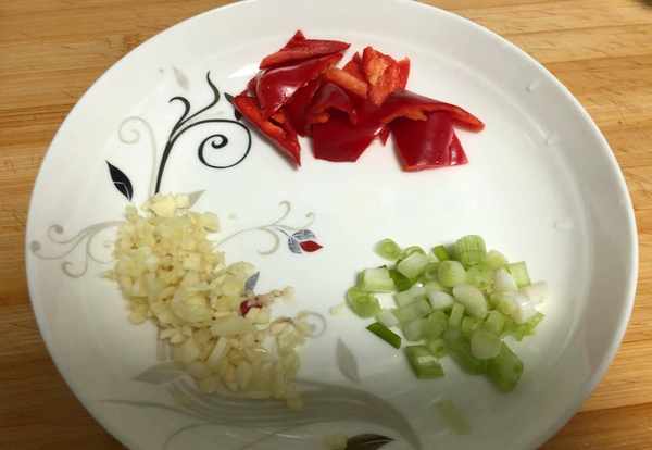 3、葱剥皮洗净切葱花,红辣椒洗净去蒂除籽切片,蒜剥皮洗净,用刀背将蒜拍扁切成蒜粒,再切成蒜末备用;