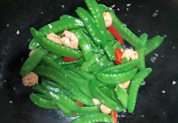 7、倒入焯水后的荷兰豆翻炒片刻,将荷兰豆和葱花蒜末翻炒均匀,接着再倒入炒好的虾仁继续翻炒;