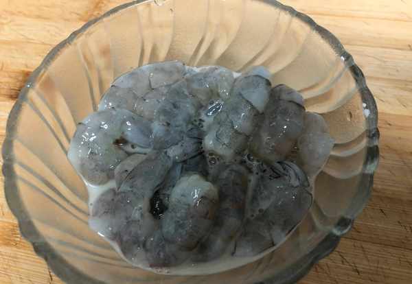 1、鲜虾摘掉虾头、剥掉虾壳、去掉虾线,清洗干净,放入小碗中,加入胡椒粉、料酒、淀粉,搅拌均匀后腌制15分钟,也可以用虾仁代替鲜虾;