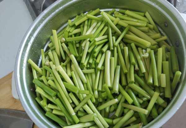食材:蒜苔1000克,老冰糖100克,香醋150克,酱油200克,清水600克,白酒10克。