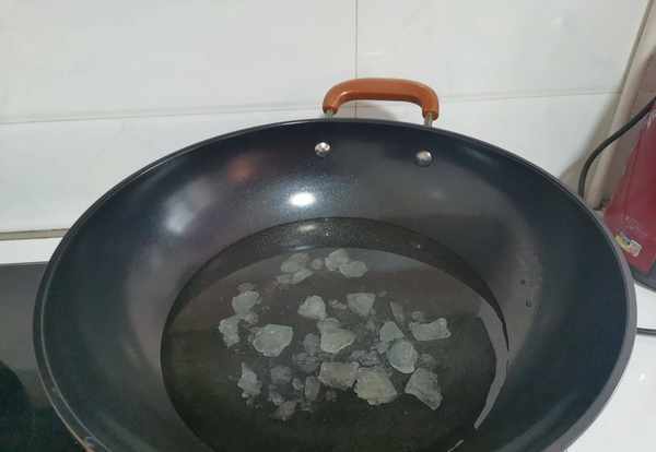 步骤二、锅里倒入清水,加入老冰糖,大火将冰糖煮开煮化掉。(冰糖比较大块的,可以先用刀把冰糖剁成小块。)