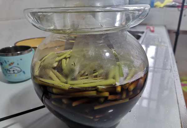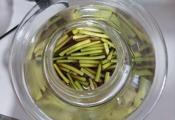 步骤四、蒜苔表面的水分都晾干后,倒入干净无水无油的玻璃罐里,再把晾凉的料汁水倒入蒜苔上,加入10克的白酒可以起到增香,蒜苔还不易坏。