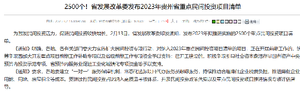 贵州省发改委于2月中旬公布了2023年拟推进实施的2500个重点民间投资项目清单,总投资近1.2万亿元。
