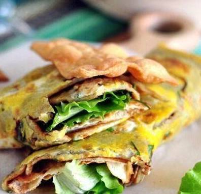 煎饼果子。山东的煎饼果子最好吃,外皮酥脆适口,内陷丰富饱满,,没有吃过的宝宝们有机会来山东尝尝。