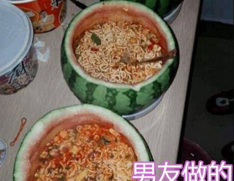 最后的这个就是男朋友给自己做的泡面了,看上去瞬间就觉得有点接受不了,为了不想刷碗直接就把方便面放到了西瓜皮里面,然后再加入了一些热水,吃起来的那种口感肯定也是非常奇怪的吧,不分手还要留着过年吗?