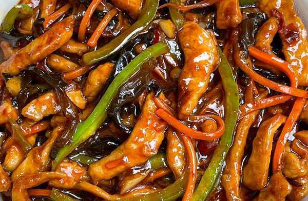 锅中油烧热,爆香蒜末,倒入猪肉碎炒至变色,加入青椒、胡萝卜、黑菇炒软,淋上酱汁起锅。直到汤变稠。