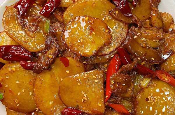 锅内倒入适量的油,油烧热,放入土豆片煎至两面金黄,盛出备用,放入五花肉炒出肥肉,放入葱、姜、蒜、花椒和干红辣椒。炒香,加入豆瓣酱炒至红色。油。