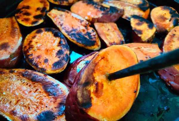 3.一面金黄斑驳,再煎另一面。约8分钟后,用筷子扎一下,很容易就扎透了。刚出锅就可以烤出美味的烤红薯。真是又香又甜。