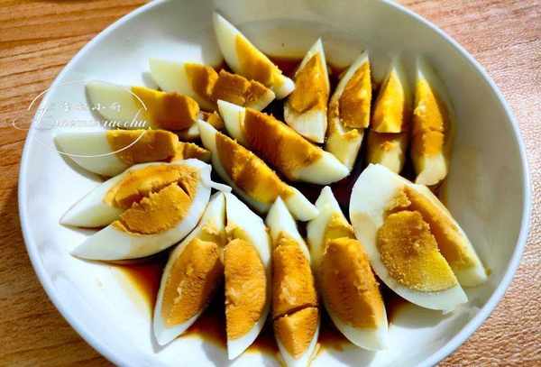 3.鸡蛋去皮,用打蛋器切成块,装盘,加4汤匙生抽,2汤匙香油即可上桌