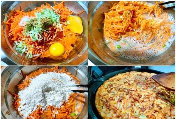 所需材料:胡萝卜2根,鸡蛋2个,面粉适量,葱花,十三香,盐,水,植物油