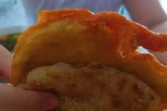 这就是河北的烧饼,里面裹了麻酱,外面沾了芝麻,尤其是刚出炉的烧饼,外皮酥脆掉渣,混合着芝麻酱的香味,非常好吃!兰州人在外可能牵挂的就是那碗牛肉面,而河北人在外,最勾魂的就是芝麻烧饼。可以夹剁碎的卤肉、切片的火腿肠,也可以夹土豆丝、海带丝、豆腐丝、藕夹、茄夹等各类蔬菜。夹肉的4—5元一个,夹菜的1—2元1个。