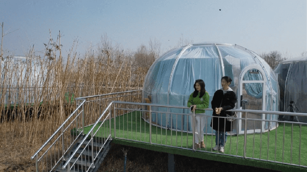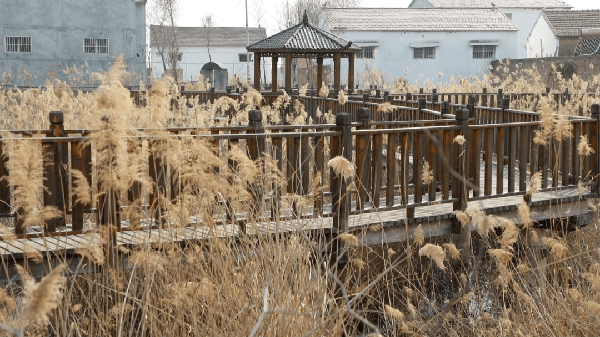 范县韩徐庄村豫北荷乡民宿游客 吴女士:因为这里有很多东西我们都没有见过嘛,后面还有一片很漂亮的芦苇荡,之前都是没有见过的。透过小窗户看,大概可以看到风的形状。